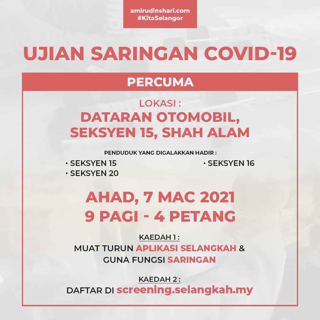 1062021 The Selangor state government announced that they will be giving out free COVID-19 home assessment tools to help patients who are self-isolating at home In a statement yesterday 9 June Selangor Menteri Besar Amirudin Shari announced that the initiative is part of Pakej Kita Selangor 20 where the state government has allocated RM55156 million to benefit at least 16. Ini senarai lokasi untuk lakukan ujian swab percuma di zon merah. Saringan ini percuma bagi penduduk Selangor dan akan.