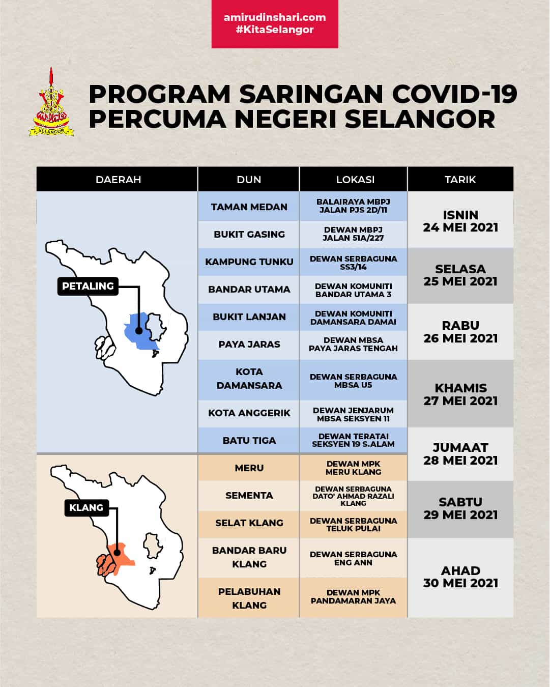 KAKITANGAN AWAM SELANGOR SAHAJA Kemaskini 7 November 2020. 752021 But the Selangor Task Force COVID-19 has released the locations for their first stops in Kajang and Semenyih on Facebook. Ujian saringan percuma di seluruh Selangor.